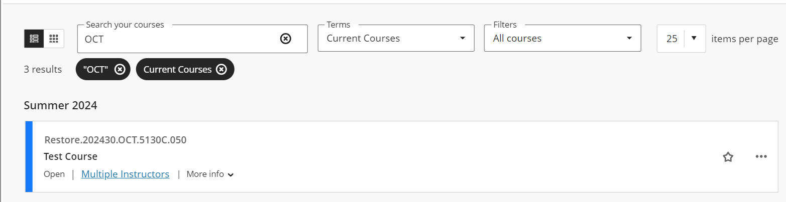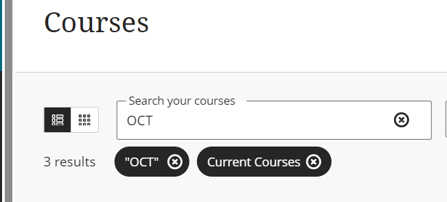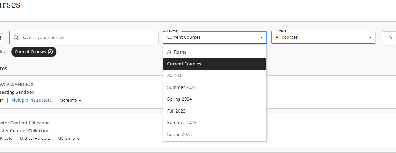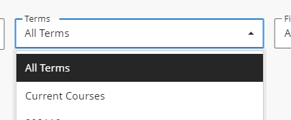 - Term selector - This dropdown menu allows you to choose a term to filter courses by. You can use on its own or with other filters: