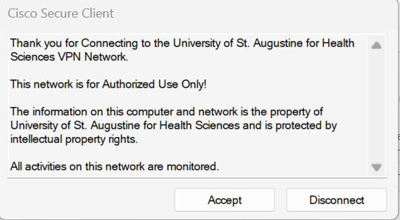 A successful login will prompt this box to pop up. Confirm you understand by accepting and completing the connection to the VPN.